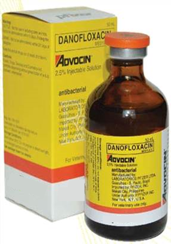 - Dung dịch Danofloxacin mesylate (Advocin) được hấp thu nhanh chóng từ vùng tiêm và đạt hàm lượng cao tối đa trong mô phổi. Trong vòng 1 giờ sau lần tiêm đầu tiên, hàm lượng cao nhất trong phổi gấp 4 lần trong huyết tương. Hàm lượng diệt khuẩn sau đó tồn lưu lâu trong mô phổi trên heo và bò hơn 12 giờ.